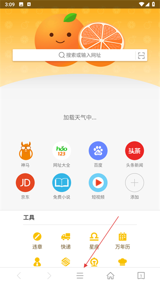 1、打開桔子瀏覽器應(yīng)用,點擊底部菜單欄的三橫線圖標(biāo)。