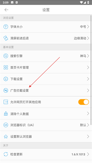 3、在設(shè)置頁面,點擊廣告攔截設(shè)置選項,進入廣告攔截設(shè)置頁面。