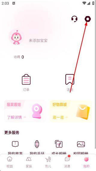 1、打開愛維寶貝app點(diǎn)擊底部中的我的選項(xiàng)進(jìn)入個(gè)人界面,點(diǎn)擊界面右上角的設(shè)置圖標(biāo)。