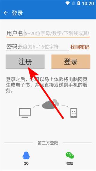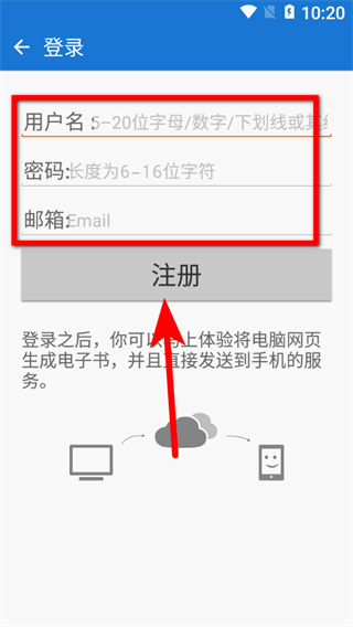 4、在注冊信息填寫頁面,填寫用戶名、密碼、郵箱后,點擊注冊按鈕,完成賬號注冊。