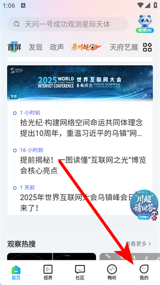 1、打開(kāi)四川觀(guān)察APP,點(diǎn)擊右下角我的,進(jìn)入個(gè)人的頁(yè)面。