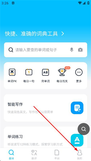 4、通過點(diǎn)擊"單詞"選項(xiàng),用戶可以利用智能背單詞功能,同時(shí)還可以查看之前的查詞記錄和生詞本,幫助記憶和復(fù)習(xí)單詞。