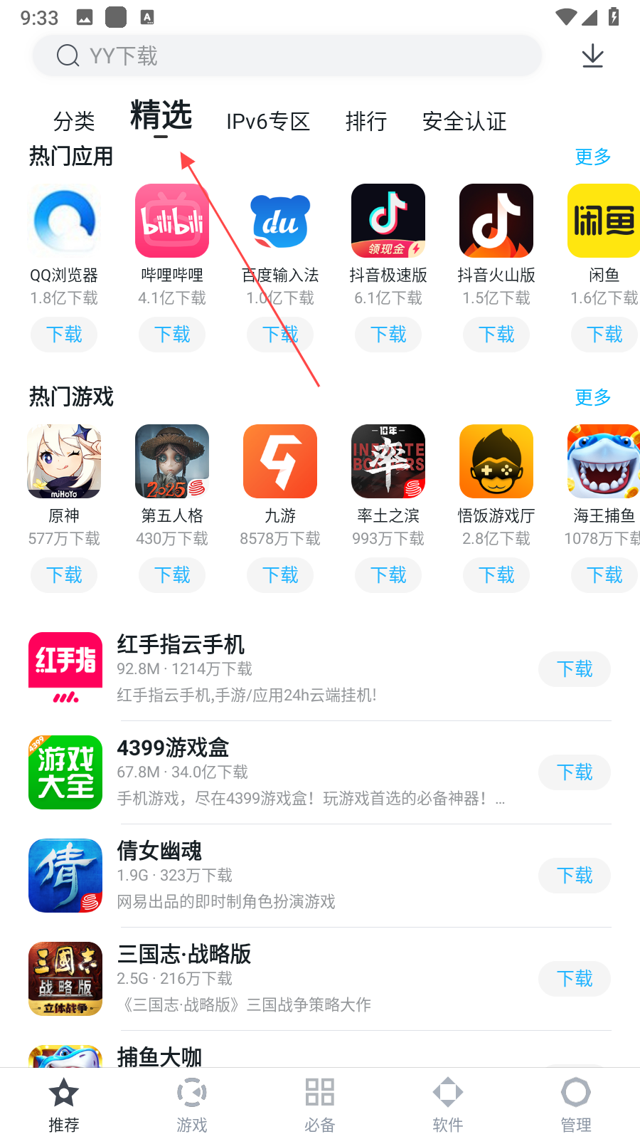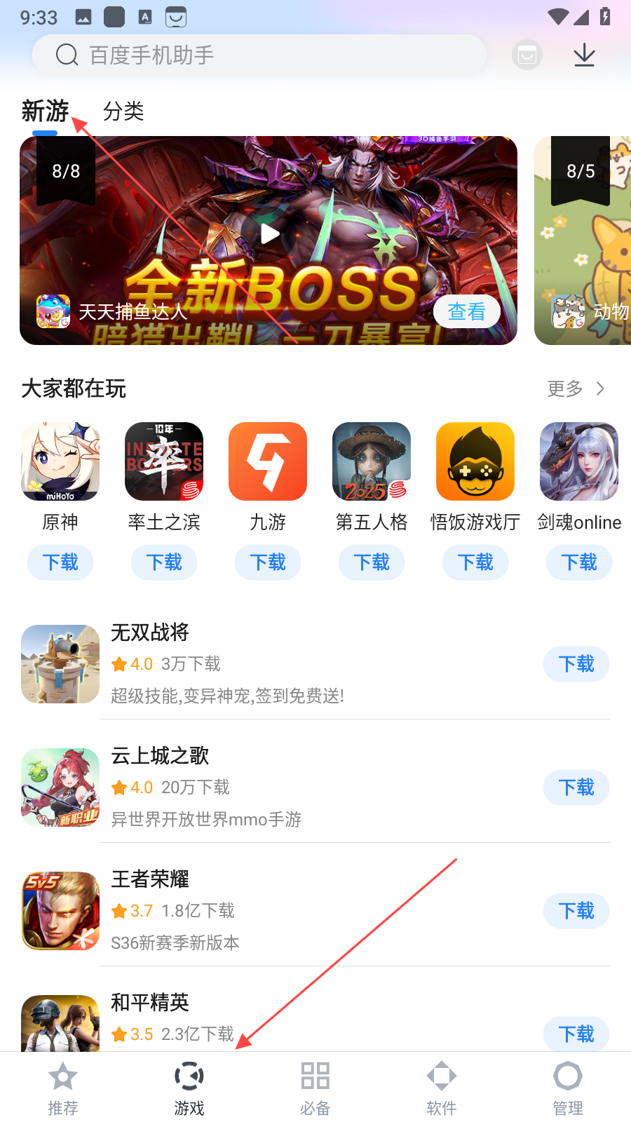 2、點擊底部導(dǎo)航欄的游戲選項,進入游戲界面,在該界面可通過新游標簽了解最新上線的游戲,也能在大家都在玩板塊發(fā)現(xiàn)當下熱門游戲,點擊游戲下方的下載”即可安裝體驗。