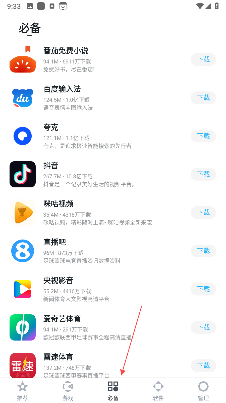 3、點擊底部導(dǎo)航欄的必備選項,這里推薦了各類常用的優(yōu)質(zhì)應(yīng)用,如閱讀類的番茄免費小說、工具類的百度輸入法等。若有需要,點擊應(yīng)用下方的下載按鈕就能完成應(yīng)用下載安裝。
