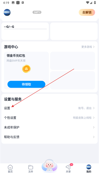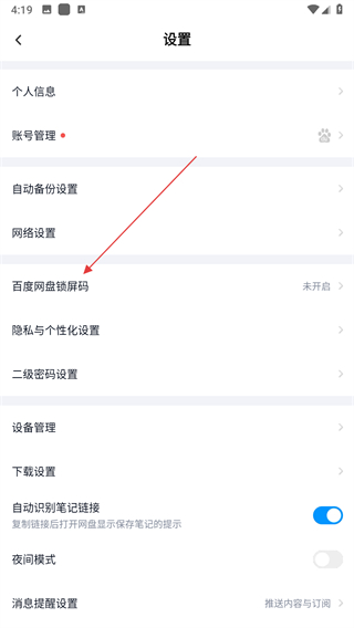 3、在設(shè)置頁(yè)面,點(diǎn)擊百度網(wǎng)盤(pán)鎖屏碼選項(xiàng)。