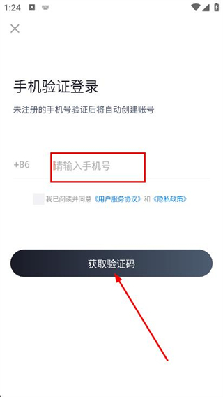 3、在手機(jī)驗(yàn)證登錄頁面,輸入手機(jī)號并獲取驗(yàn)證碼。