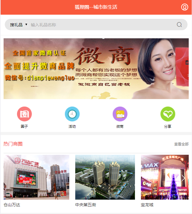 圈子(購(gòu)物服務(wù));活動(dòng)(同城社交);分享(線上社交);微商(微商認(rèn)證宣傳)。