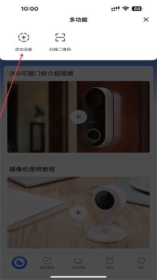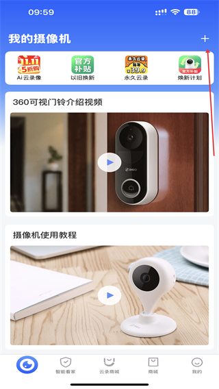 1、打開360智能攝像機的應(yīng)用,進入時點擊右上角+的圖標。