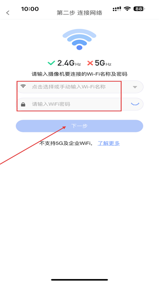 4、在該頁面內(nèi),輸入Wi-Fi名稱、密碼后,點擊下一步即可完成。