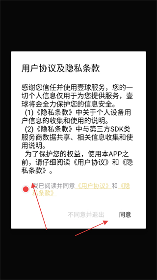 1、打開(kāi)壹球APP,在用戶協(xié)議及隱私條款頁(yè)面,勾選用戶協(xié)議和隱私條款,點(diǎn)擊同意。