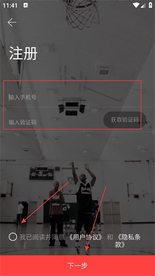 3、輸入手機(jī)號(hào)、驗(yàn)證碼,勾選協(xié)議和隱私條款,點(diǎn)擊下一步,完成賬號(hào)注冊(cè)。