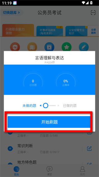 2、在考研分類界面,點(diǎn)擊公務(wù)員考試選項(xiàng),進(jìn)入對(duì)應(yīng)題庫頁面。