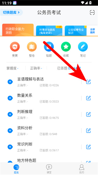 3、在公務(wù)員考試題庫頁面,點(diǎn)擊言語理解與表達(dá)等題型的編輯圖標(biāo),進(jìn)入題型詳情界面。