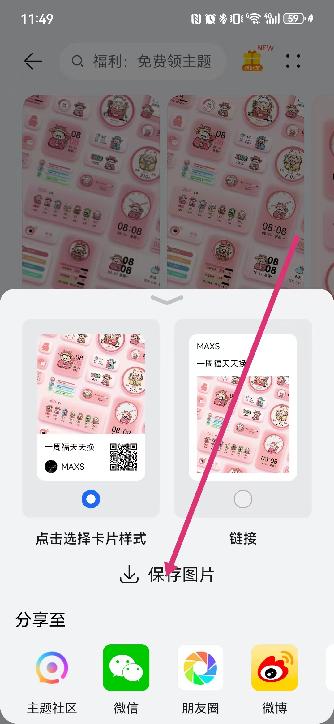 4、在分享界面,點擊保存圖片選項,即可將主題圖片保存到手機(jī)。