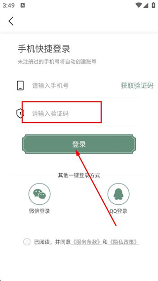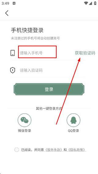 3、在手機快捷登錄頁面,輸入手機號并獲取驗證碼。