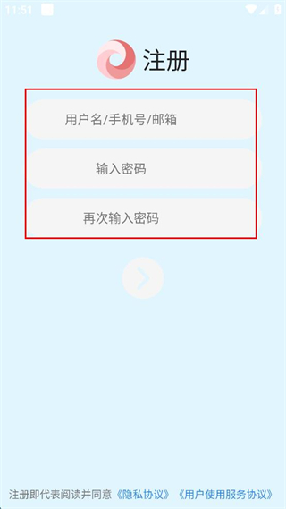 4、依次填寫用戶名/手機號/郵箱、輸入密碼、再次輸入密碼,完成注冊操作。