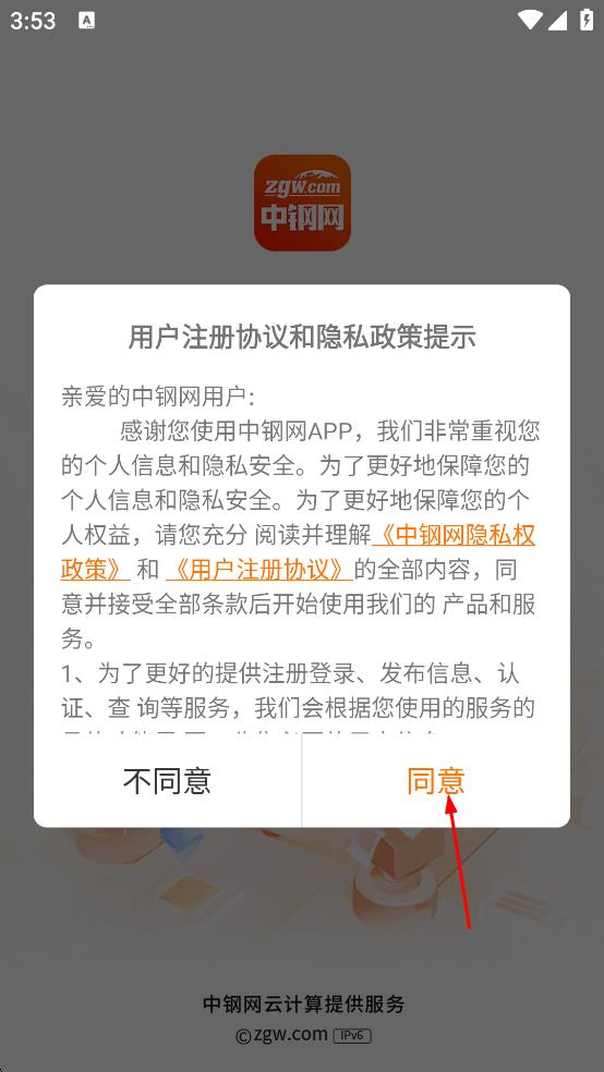 1、打開中鋼網(wǎng),會彈出用戶注冊協(xié)議和隱私政策提示頁面,仔細(xì)閱讀后點(diǎn)擊同意按鈕。