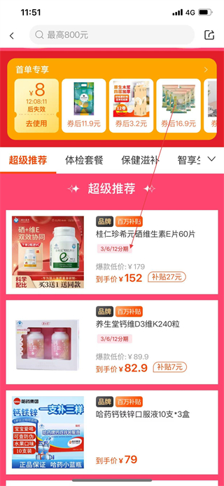 2、進(jìn)入百億補(bǔ)貼后,點(diǎn)擊想要購(gòu)買(mǎi)的藥品,進(jìn)入藥品詳情頁(yè)。