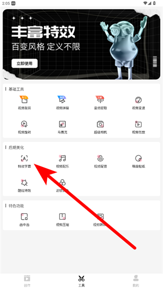 2、在工具界面的后期美化板塊,點擊特效字幕。