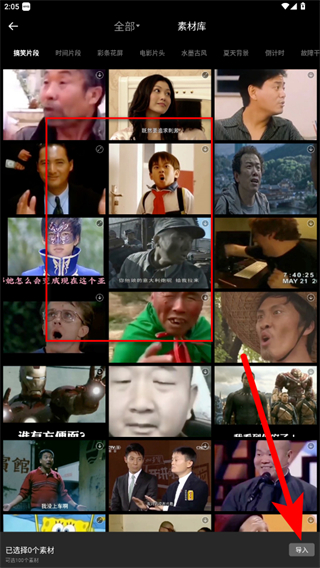3、進(jìn)入素材選擇頁面,從相冊中選擇要添加字幕的視頻素材,選中后點擊右下角的導(dǎo)入按鈕。