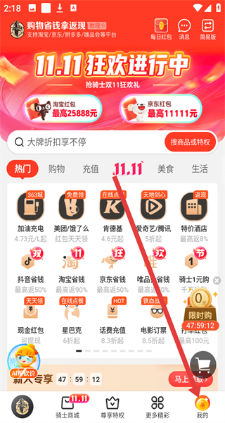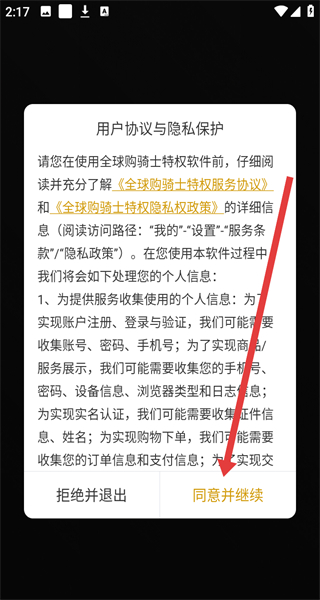 1、點擊“用戶協(xié)議與隱私保護”彈窗的“同意并繼續(xù)”,進入全球購騎士特權APP首頁。