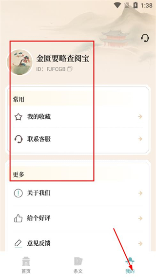 3、進(jìn)入我的頁(yè)面,可查看我的收藏,管理收藏的經(jīng)方或條文,還能聯(lián)系客服、意見反饋,了解關(guān)于我們等信息。