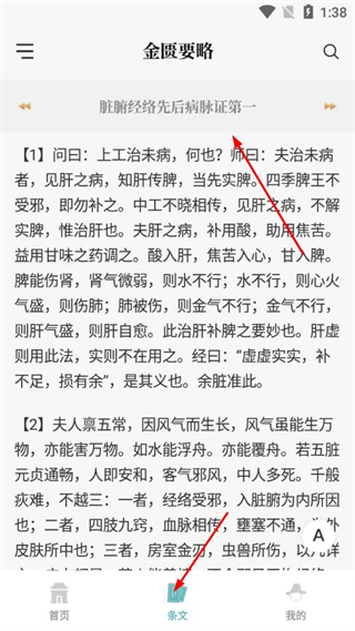2、點(diǎn)擊條文選項(xiàng),可查看金匱要略的具體條文內(nèi)容,如臟腑經(jīng)絡(luò)先后病脈證第一等篇章,助力用戶深入學(xué)習(xí)經(jīng)典條文。