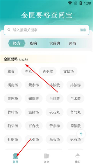1、在首頁(yè)經(jīng)方標(biāo)簽下,可查看金匱要略包含的162方,如雄黃、赤丸、豬苓散等方劑,方便用戶查詢經(jīng)方信息。