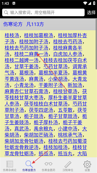 2、收錄了113首傷寒論方,如桂枝湯、麻黃湯等,可快速查找方劑組成及相關(guān)信息。