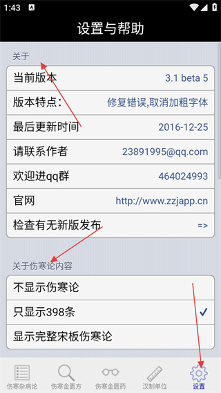 5、可選擇是否顯示完整宋板傷寒論、調(diào)整傷寒論內(nèi)容顯示范圍,還能查看軟件版本、聯(lián)系作者等。