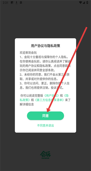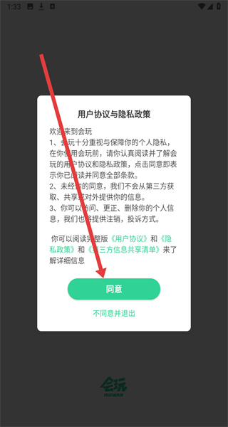 1、在打開會玩app后,在彈出的彈窗中點擊同意按鈕,進(jìn)入使用。