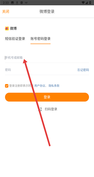 4、在跳轉(zhuǎn)到微博登錄界面中,依次填寫手機(jī)號和密碼信息后,點擊登錄按鈕完成登錄。