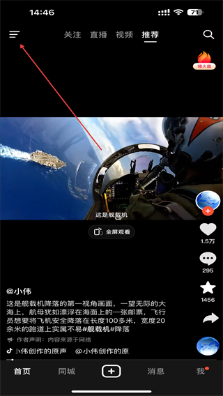 1、打開(kāi)火山小視頻的APP,進(jìn)入時(shí)點(diǎn)擊左上角的圖標(biāo)。