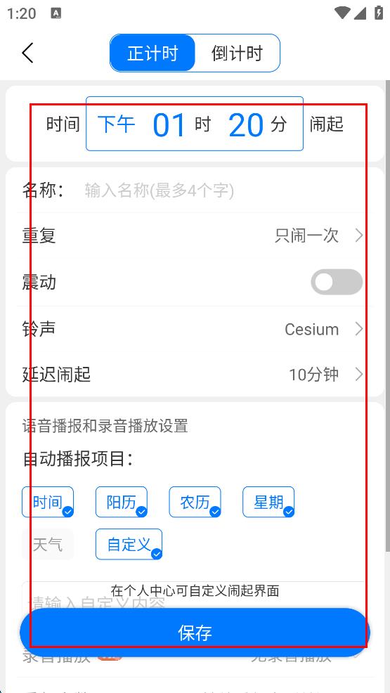 4、在鬧鐘設(shè)置頁面設(shè)置鬧起時間、名稱等相關(guān)信息,設(shè)置完成后點擊保存按鈕。