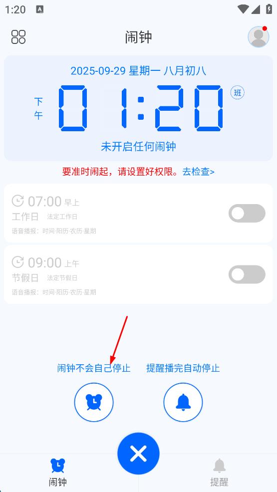 3、選擇鬧鐘不會自己停止類型,進入鬧鐘設(shè)置頁面。