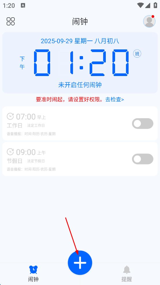 2、進入鬧鐘頁面,點擊下方藍色加號按鈕,彈出鬧鐘類型選擇選項。