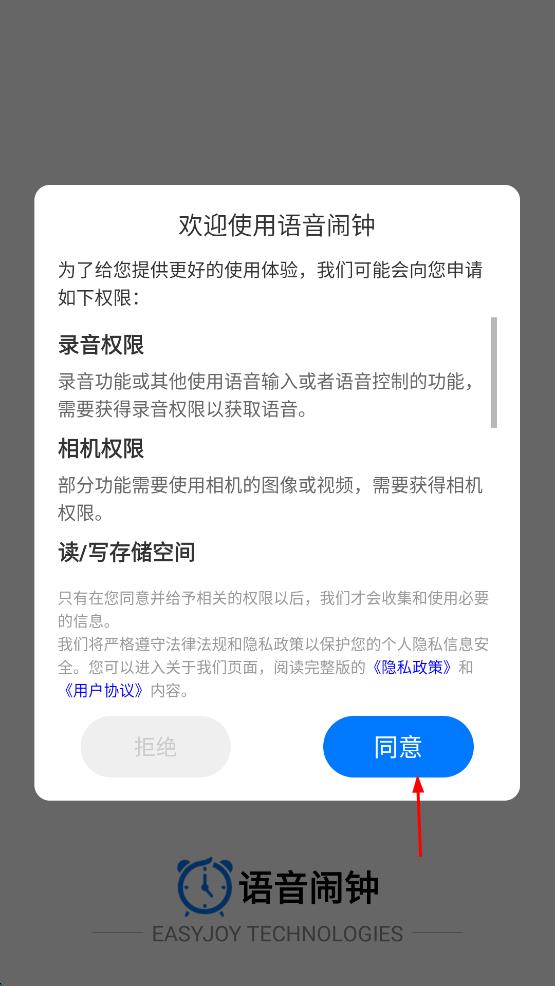 1、打開語音鬧鐘App,出現(xiàn)權(quán)限申請彈窗,閱讀后點擊同意按鈕。