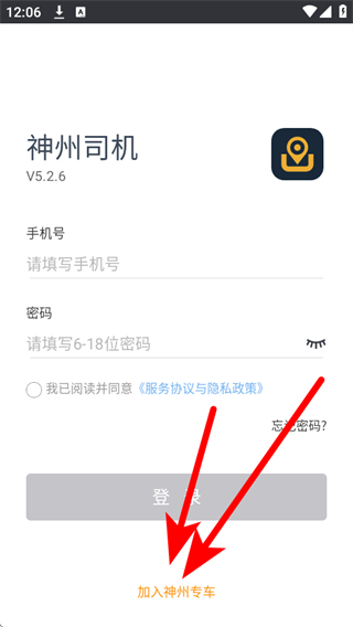 2、在登錄頁面,可選擇填寫手機(jī)號和密碼進(jìn)行登錄,也可點(diǎn)擊“加入神州專車”,進(jìn)入到加入方式選擇界面。