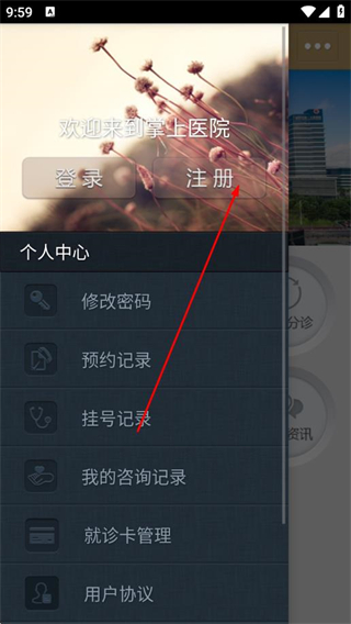 打開軟件后,點擊左上角按鈕(紅框位置),再點擊注冊,輸入您的手機號碼,設置6—16位的密碼,點擊“獲取驗證碼”按鈕,將收到的短信驗證碼輸入框中,再點擊“注冊”。