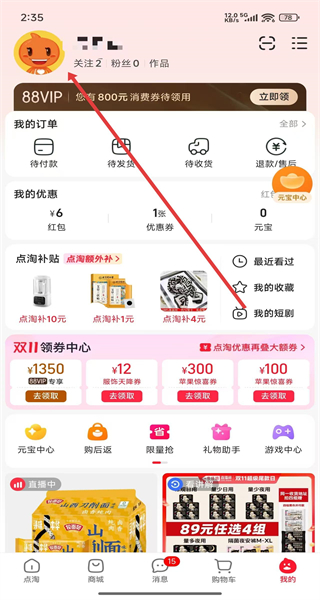1、打開點(diǎn)淘app,在底部導(dǎo)航欄點(diǎn)擊左側(cè)第一個(gè)圖標(biāo),進(jìn)入頁(yè)界面,在首頁(yè)上方有關(guān)注、直播、短劇、推薦、等選項(xiàng)卡。