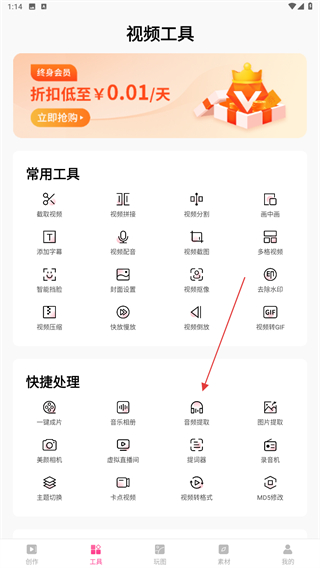 2、進入視頻工具的頁面內(nèi),點擊音頻提取的功能按鈕。