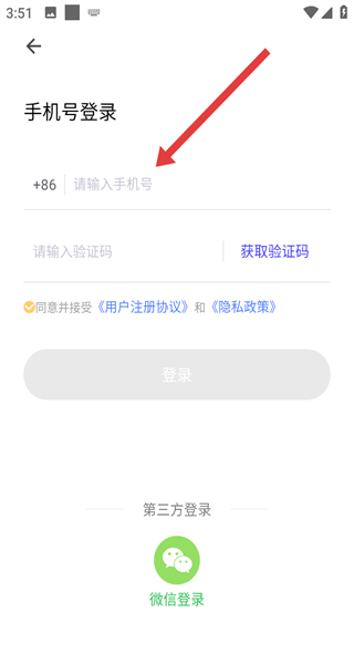 4、在登錄界面,輸入手機號碼后點擊獲取驗證碼,將收到的驗證碼輸入到驗證碼輸入框中,點擊登錄按鈕,完成賬號登錄操作。