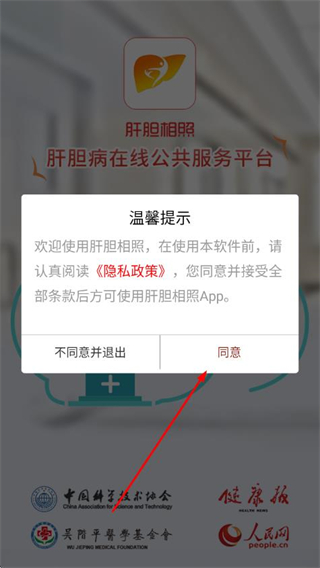 1、打開肝膽相照專家版APP,在溫馨提示頁面點(diǎn)擊同意。