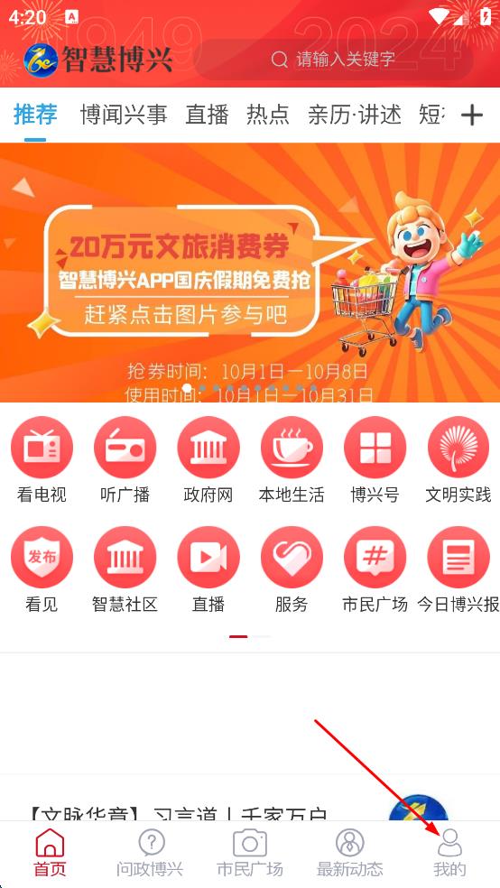 2、進(jìn)入智慧博興APP主界面,點(diǎn)擊右下角我的選項(xiàng),進(jìn)入個(gè)人相關(guān)頁(yè)面。