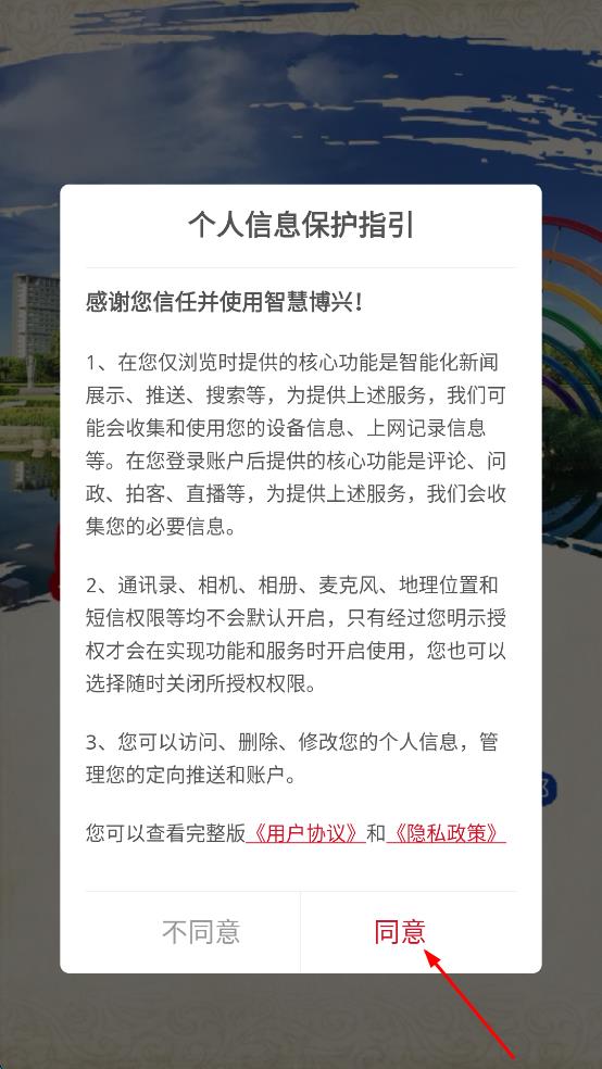 1、打開(kāi)智慧博興APP,在彈出的個(gè)人信息保護(hù)指引頁(yè)面,認(rèn)真查看相關(guān)內(nèi)容后,點(diǎn)擊同意按鈕。