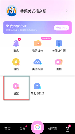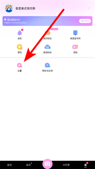 1、打開美顏相機(jī)APP,進(jìn)入個人頁面后點(diǎn)擊設(shè)置,進(jìn)入設(shè)置頁面。