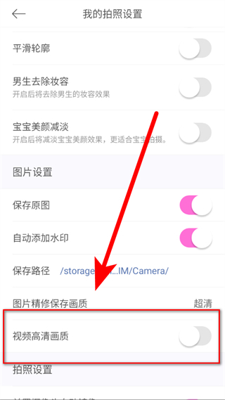 4、在我的拍照設(shè)置頁面,找到視頻高清畫質(zhì)選項(xiàng),將其開關(guān)打開,即可開啟美顏相機(jī)的視頻高清畫質(zhì)模式。