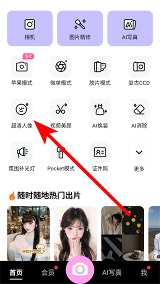 1、打開美顏相機(jī)APP,在首頁找到超清人像選項(xiàng)并點(diǎn)擊,進(jìn)入超清拍照設(shè)置頁面。