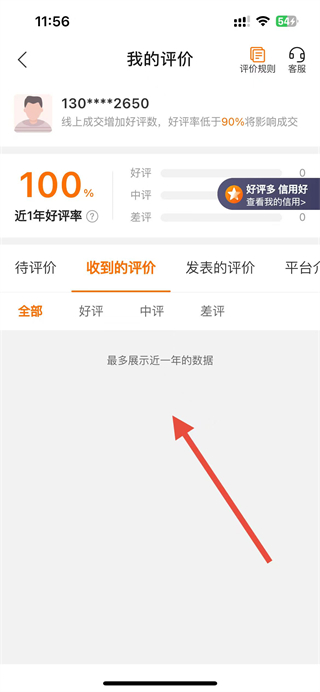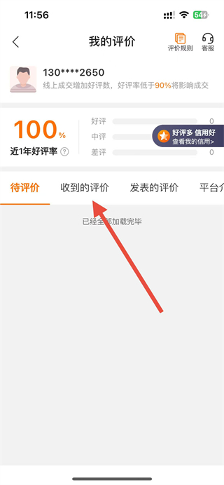 3、在我的評價頁面可點擊收到的評價等標簽。
