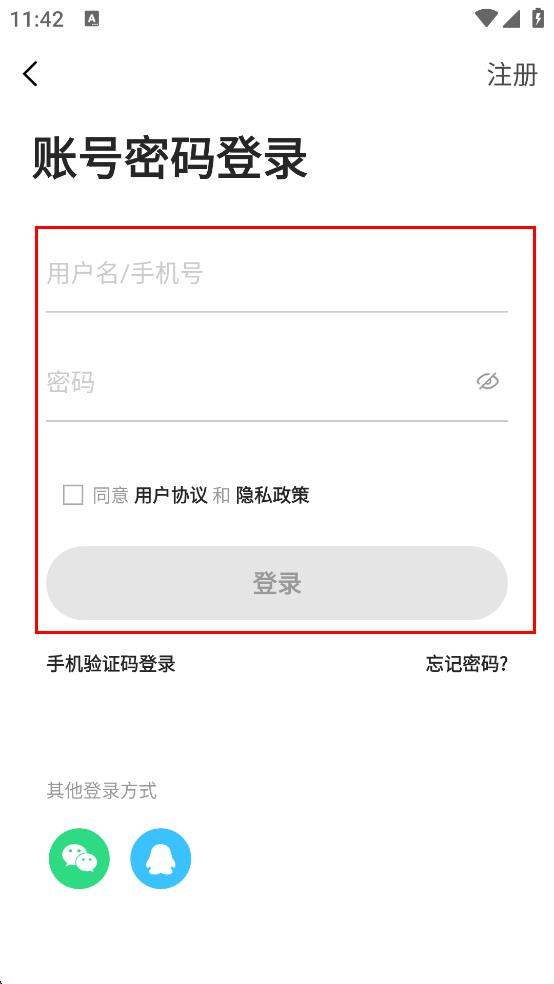 4、在賬號密碼登錄界面,輸入用戶名或手機號、密碼,勾選“同意用戶協議和隱私政策”,點擊“登錄”按鈕。